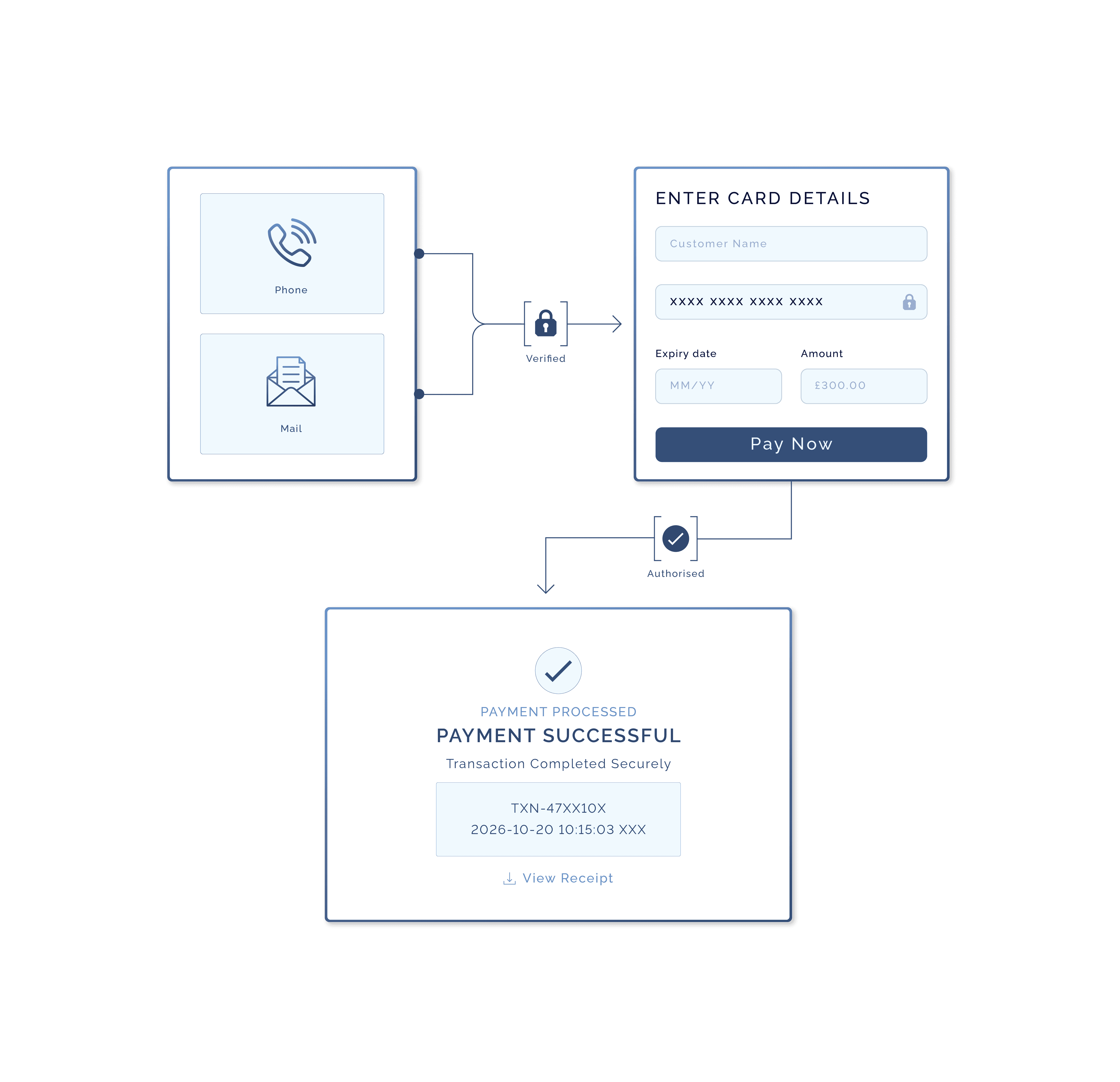 Enter customer card details securely through your TWPayz portal. Perfect for phone orders, invoice payments and mail order sales. No website needed.