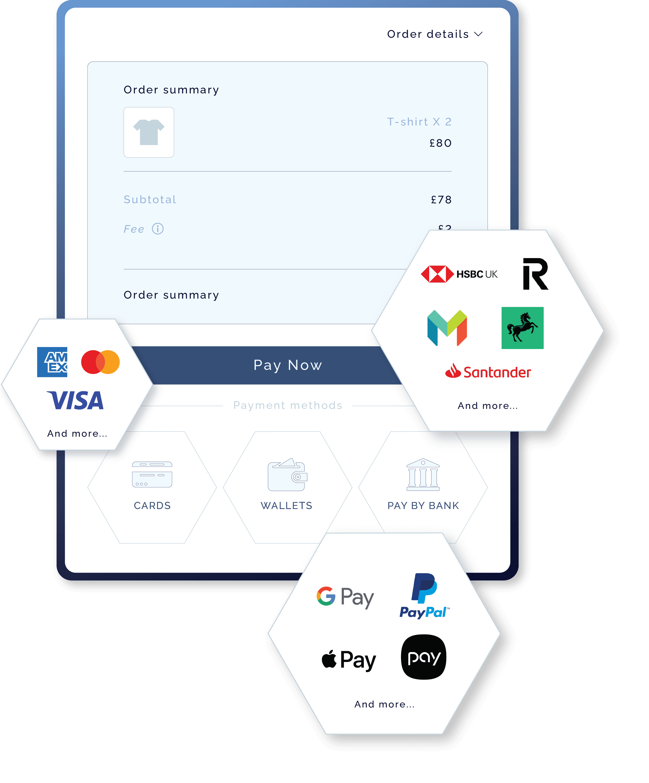 Checkout pages that match your brand. Works with Shopify, WooCommerce, Presta and other ecommerce platforms. Customers complete payment without leaving your store.